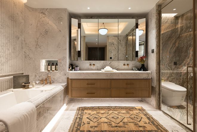 正对玄关的位置是主卫,地面墙面为巴西鱼肚灰,淋浴间为水云纱。五金品牌为GESSI,浴缸及智能马桶品牌为劳芬,定制镜柜里面配有美妆冰箱。