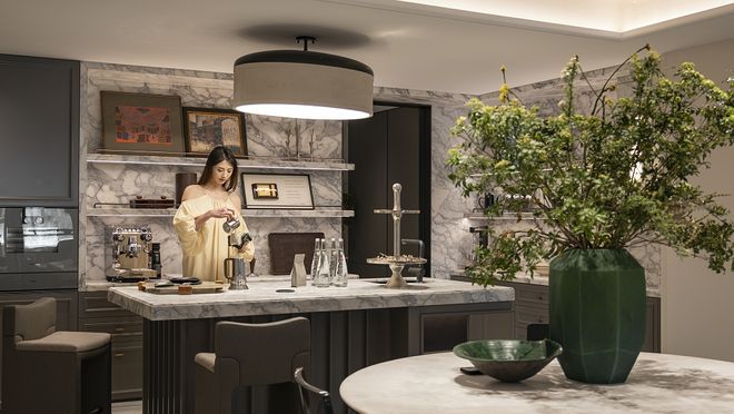 西厨的操作台做成L型,与岛台形成了整体的围合空间。西厨配置嘉格纳的蒸箱、烤箱及暖碟抽,超大面积的开放格未来可以作为电器塔空间使用,放置咖啡机、面包机或酒杯陈列等。