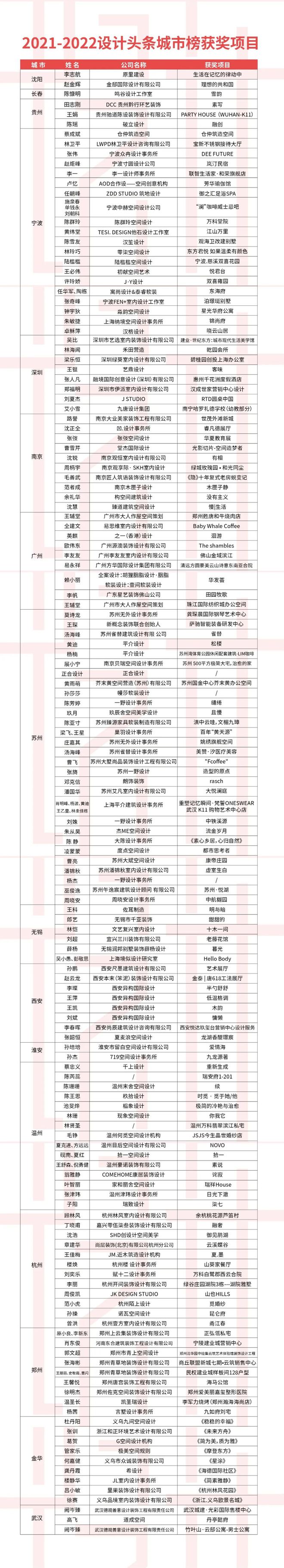 杭州、武汉、淮安、贵州、深圳、金华、南京、无锡、广州、宁波、沈阳、长春、温州、苏州、郑州、西安(以上排名不分先后),当晚,设计头条城市榜颁奖揭晓16个城市设计佳作。