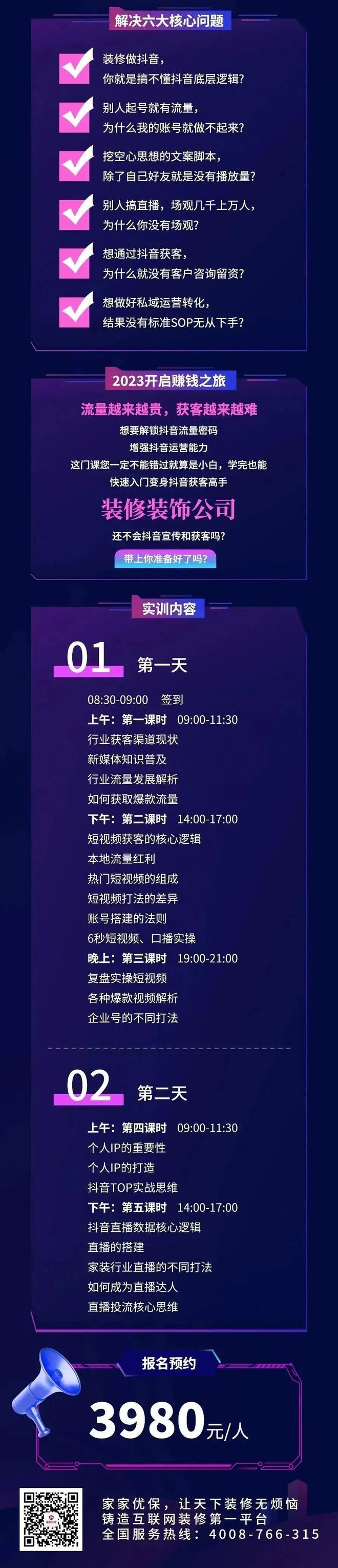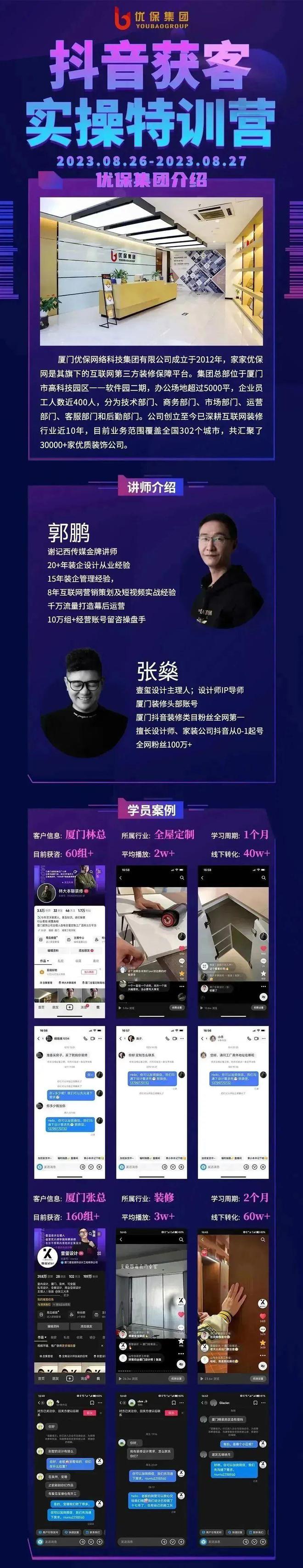 此外,家家优保还不定期举行抖音获客实操训练营,特邀金牌讲师,传授互联网营销策划及短视频实战经验,做好私域运营转化,增强的抖音运营能力杏彩体育,最大程度为合作装企引流获客,实现利益最大化。