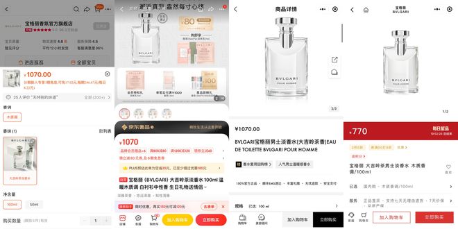 例如,宝格丽大吉岭茶男士香水100ml,在丝芙兰天猫旗舰店中一瓶标价1070元,在宝格丽自己的官方天猫旗舰店和宝格丽香氛京东自营店中,是同样的价格,如果在平台官方店直接购买,可使用平台补贴的大额优惠券,到手价990元,而同样的一瓶在中免日上只标价770元。
