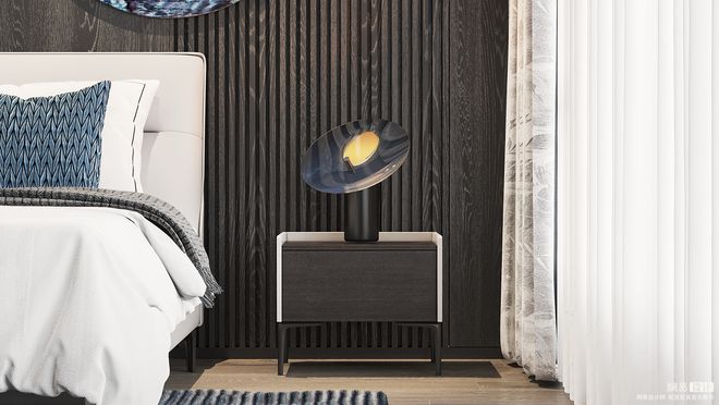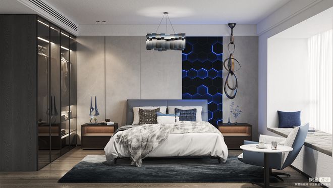 伴随着黑纹胡桃木墙咔的沉稳与蓝色的递进,极简与优雅氤氲。床屏上方的蓝色挂画,光影叠幻杏彩体育,将居者高雅的艺术审美品味,具象为对场景的解读。