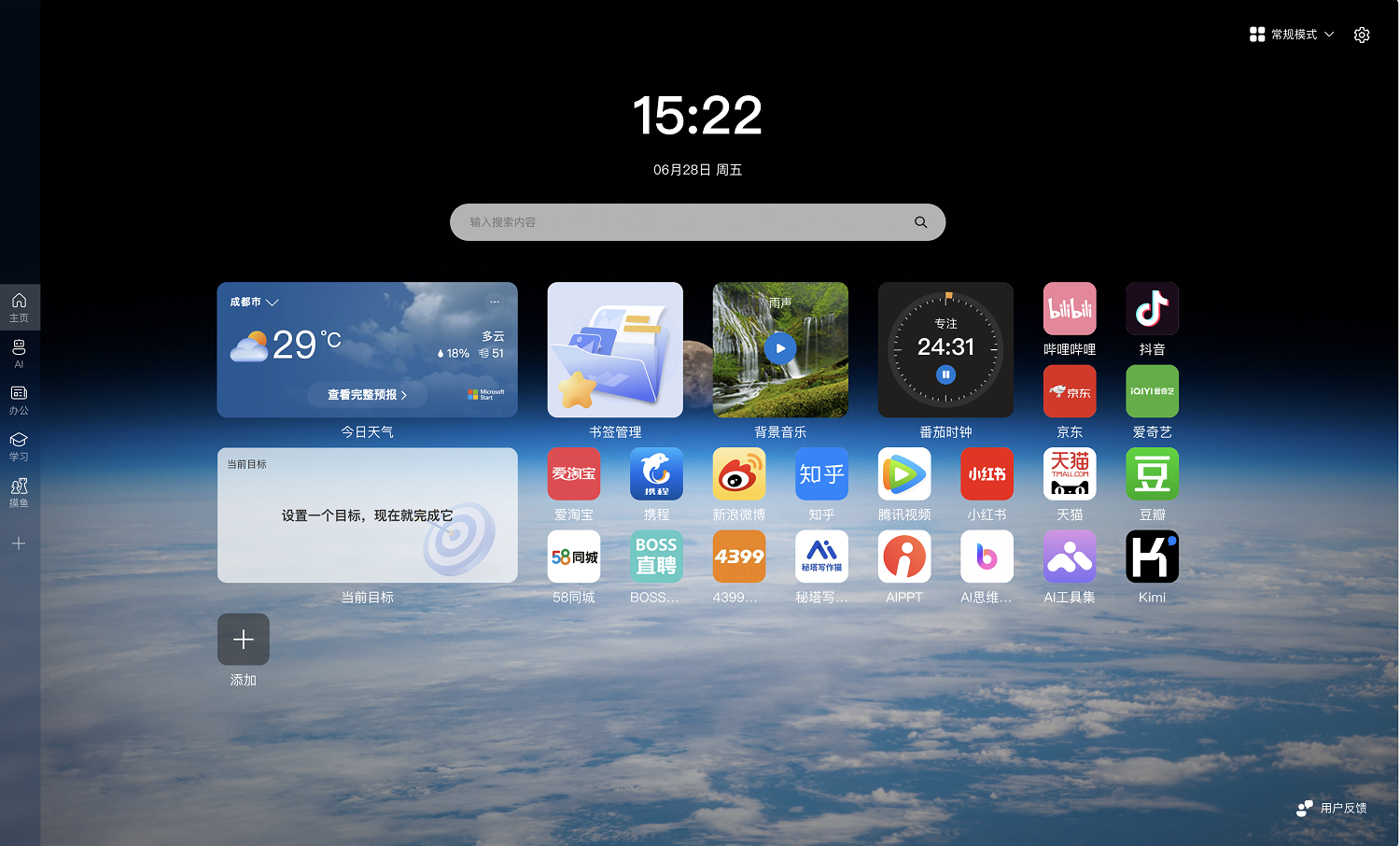 然后就是在最新的WowTab里我们还可以添加各种小组件,只需要鼠标右击,然后点击添加小组件就可以把小组件添加到你的桌面了,目前WowTab支持添加天气、背景音乐、番茄时钟、当前目标和书签管理五个小组件。这些组件搭配起来简直给浏览器做了美容,实用的同时又好看,极大的提升了的工作和学习的效率。