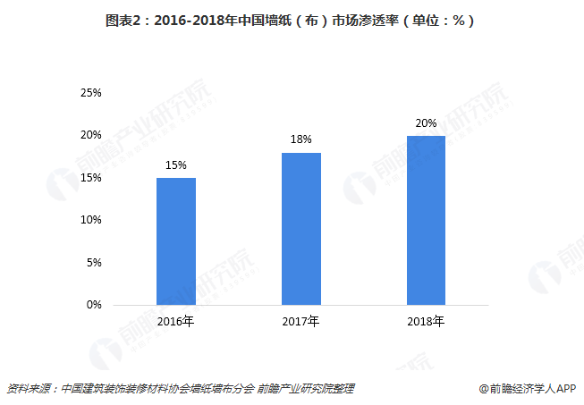 房地产行业的发展和进步,尤其是商品房销售面积的增长,为我国墙纸行业发展提供了基础,居民收入水平的增长为我国墙纸行业消费扩大提供了支撑。据中国建筑装饰装修材料协会墙纸墙布分会数据显示,2017年我国墙纸产品服务于6000万家庭,使用率占全国家庭的18%,其中在一二线城市墙面装修中占有率约为30%,而在2016年我国墙纸(布)市场渗透率约为15%,预计2018年我国墙纸(布)渗透率将达到20%。