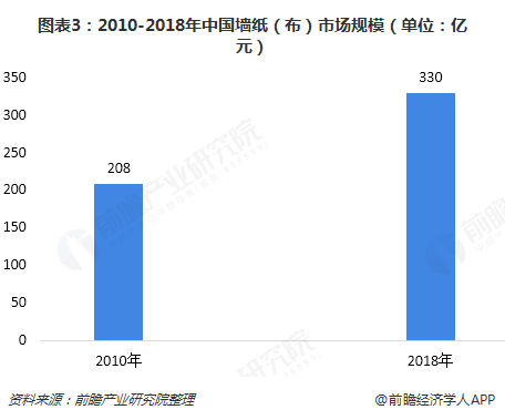 市场渗透率的提升无疑推动了我国墙纸墙布行业市场规模的扩大,根据前瞻产业研究院发布的《中国墙纸行业市场前景预测与投资战略规划分析报告》显示,2010年,我国墙纸行业市场规模约为208亿元,而根据行业协会数据,2017年墙纸销量为1.806亿卷,无缝墙布销量约合2760万卷,墙纸销量有所下滑,但无缝墙布销量大幅增长,按照平均每卷150元的价格进行计算,行业市场规模达到312.3亿元,与2016年基本持平。根据我国商品房销售面积和墙纸(布)渗透率进行初步测算,2018年我国墙纸行业市场规模将突破330亿元。