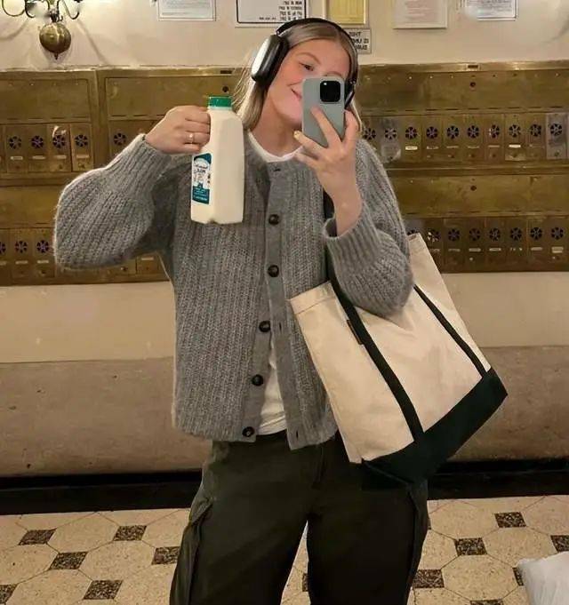 对于这一套衣裤造型的设计,圈内时尚博主们的评价都很高。在针织衫柔软的面料加持之下,我们可以穿出轻松而又舒适的氛围感,工装裤的大轮廓,帮助腿粗腿胖的女生设计足够的穿着空间,两种单品的组合,可以带给你廓形穿搭的更多启发▼