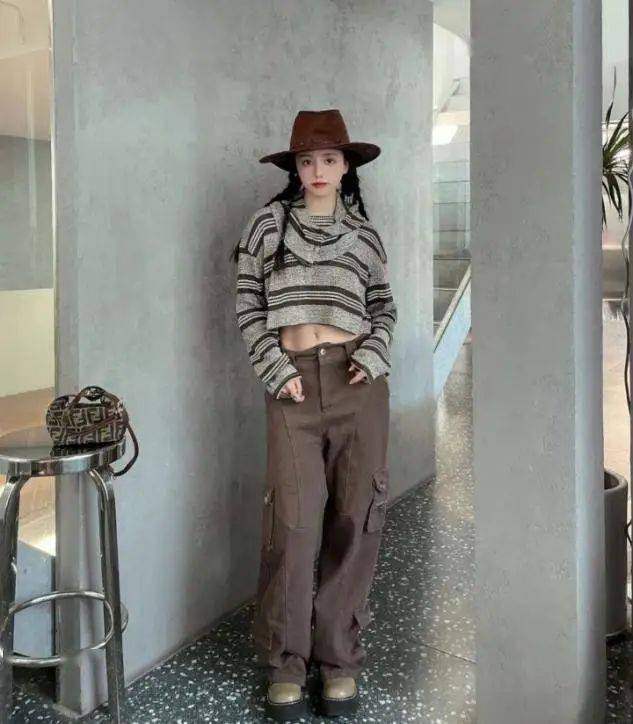 高腰工装裤露肚脐的穿法,从单品到风格设计,都是一以贯之的和甜酷风格。经过穿搭博主们的演绎,我们会发现,融入绑带和腰带作为点缀,可以展示出搭配针织衫更华丽的线条感。