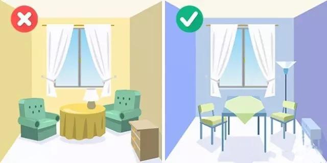 小户型本身空间就狭窄有限,要是你在搬进来落地厚重的家具、沙发,再搭配垂到地面的桌布,整个地面都被占满了,人都没地落脚。