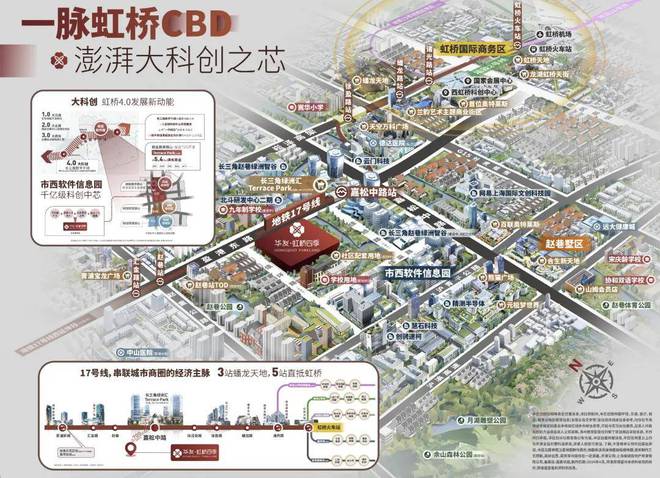 随着大虹桥科创功能西移发展的趋势,青浦新城基于“一城两翼,一带三核”发展战略目标,通过17号地铁线串联起三大核心节点,东起徐泾北斗产业基地,西到金泽华为研发基地,中部核心就是赵巷市西软件信息园,未来这条产业带上预期将会有数十万人口导入。