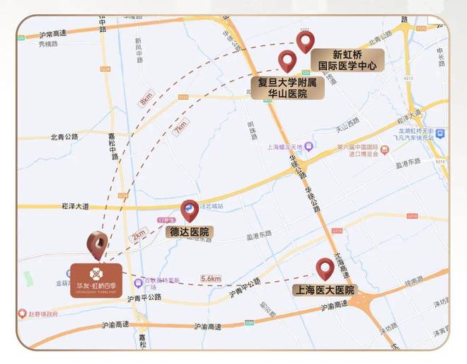 医疗方面,7公里内3家医院,约2公里到德达医院(私立医院)、约5.6公里到上海医大医院(综合)、约7公里到复旦大学附属华山医院(西虹桥分院)(甲等)
