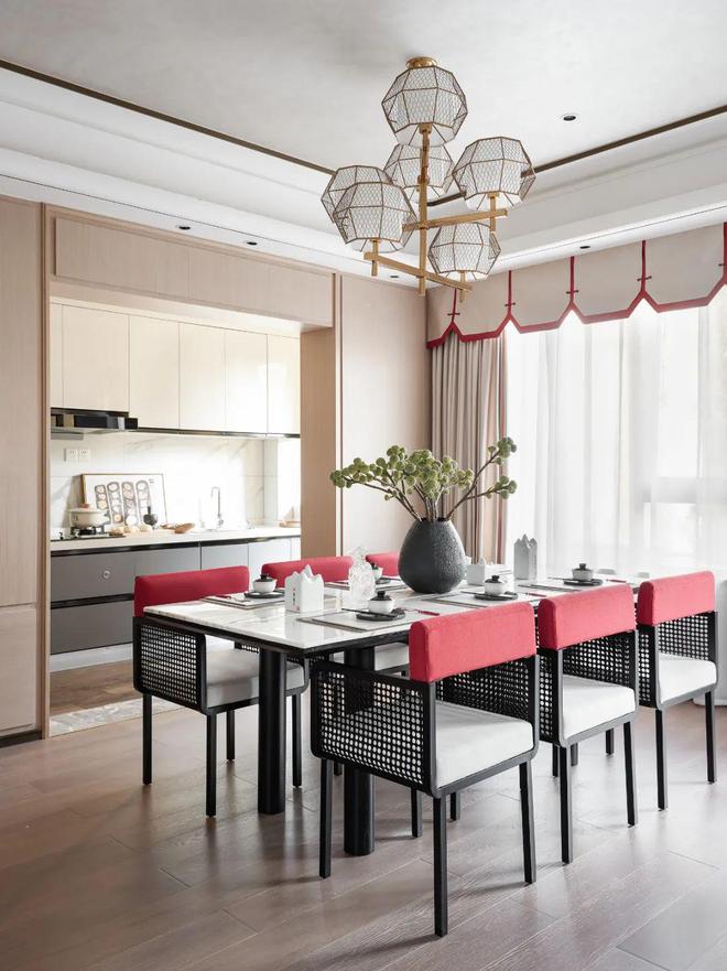 宽敞舒适的餐厅中摆放着一套很简单却又很大气的新中式风餐桌椅,而且这个餐桌椅的颜色搭配也是非常吸睛的。黑色的主框架搭配白色杏彩体育注册,再用红色进行装扮点缀,真是恰到好处的美呢!杏彩体育登录入口而且窗帘上也有红色与之相呼应,效果真是很不错呢