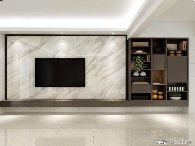 电视背景墙采用大理石,旁边设计了一个储物架,既能收纳又可以放置绿植起到很好的装饰作用。电视柜悬空设计,显得整个空间更加开阔。