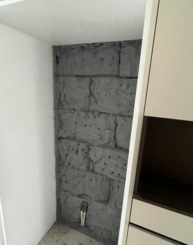 虽说柜子是与吊顶齐平了,可冰箱却突出了柜子,非常难看。最后的处理方法,是把冰箱背面的墙体拆薄一点。也好在该墙体是24cm厚的非承重墙,不过即便如此,自己也很后悔。