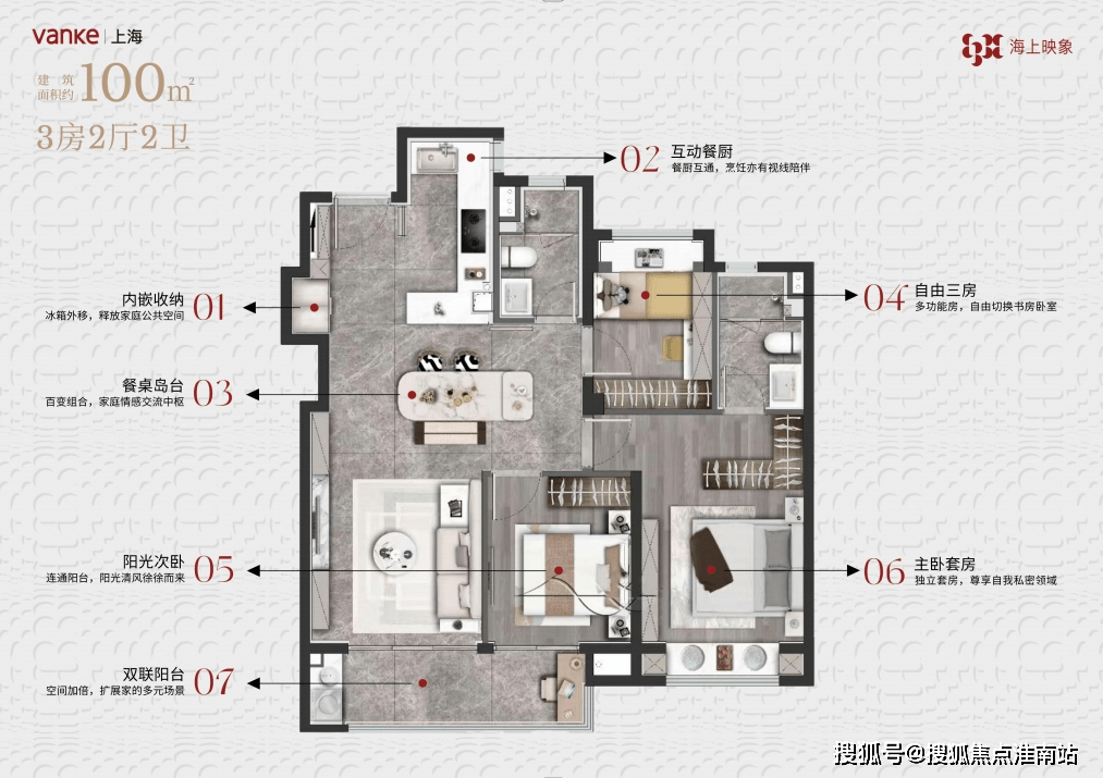 市场上传统的建面约100㎡户型,餐厅要么挤在客厅里杏彩体育,要么挤在厨房旁,给人第一感观就是很局促。而海上映象的建面约100㎡户型,餐厅不依附于任何一个空间,是一个独立的功能区。