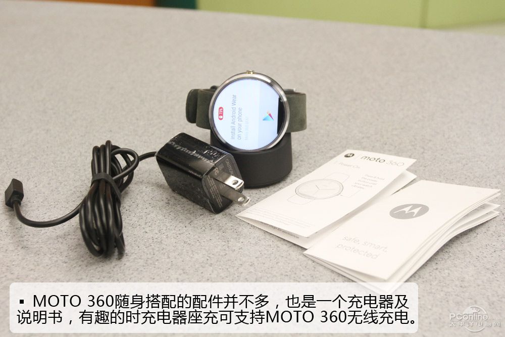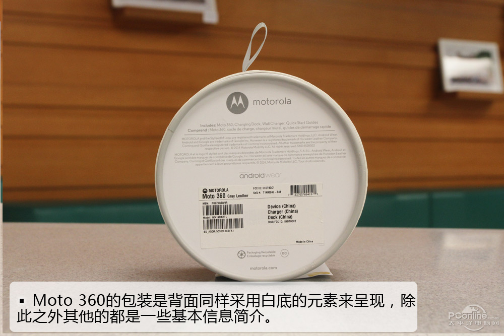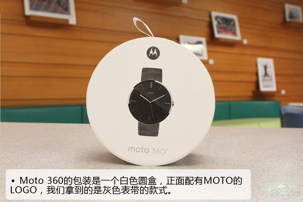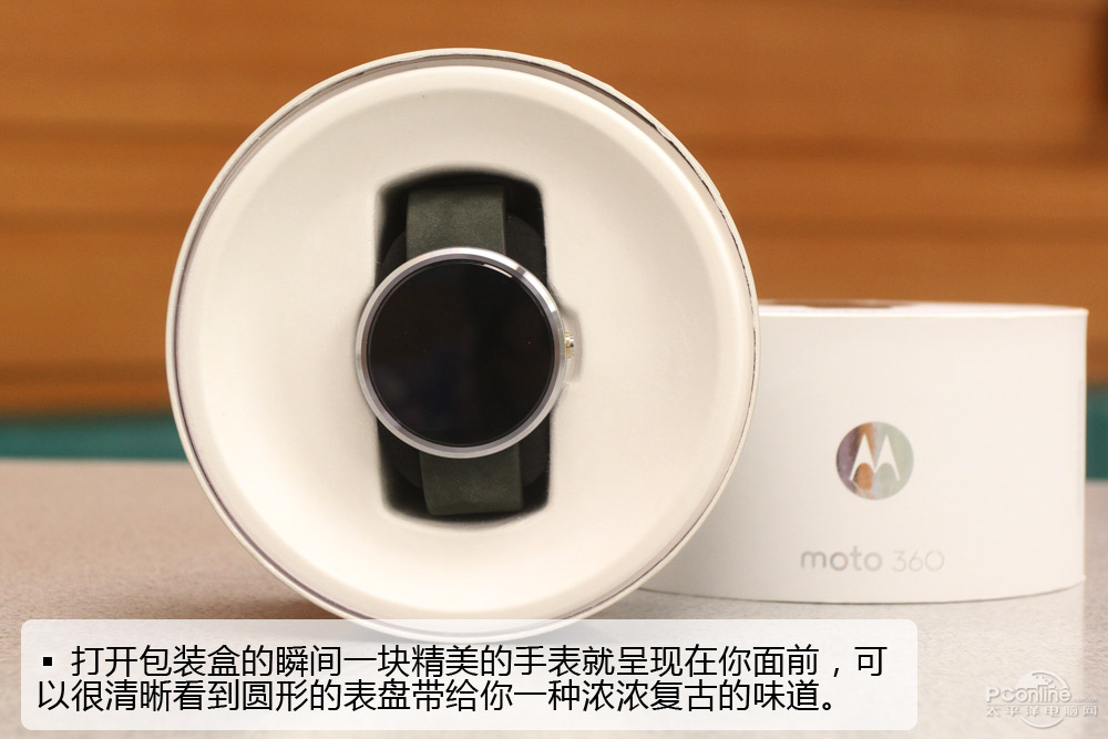 笔者刚刚拿到MOTO 360就迫不及待想打开了,但是却被这个包装盒所吸引,感觉很有趣。包装盒跟笔者常见到的手表包装盒子有些不同的在于市场大多包装盒都是正方形的而MOTO 360的包装盒子却同样采用圆形设计看来MOTO也想在包装盒子上来承托这款手表的强大。