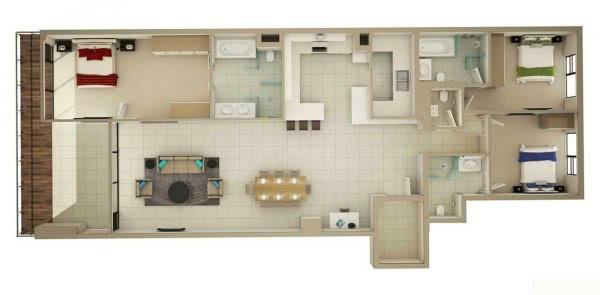 室外空间再次成为这三室设计的关键。在住宅两侧外面的阳台提供许多休闲选择,而卧室巧妙地安排,为书房和储物室留出空间。