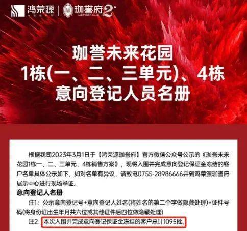 杏彩体育今天,西部网红盘鸿荣源珈誉府公示了意向登记名单,共有1095批客户成功登记,项目推1067套房,认筹比超过1:1。