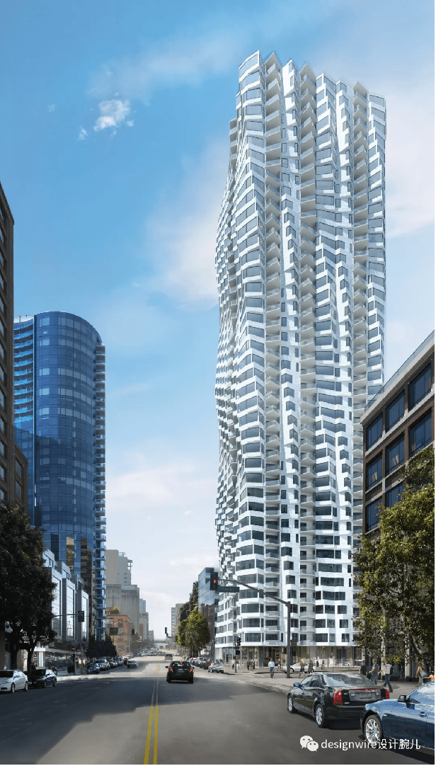 外立面的波纹形状不只是体现动感的造型,更有视线的考量,突出的阳台将使室外居民不会看到业主在房间里的状态,很好地保护了业主的隐私。