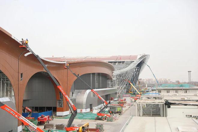 站在高处俯瞰整个新国展二期项目施工现场,各建筑已经“穿”上了紫金外衣杏彩体育,场馆之间以丝带状连廊相连,十分壮观。
