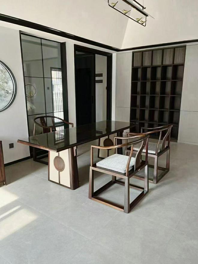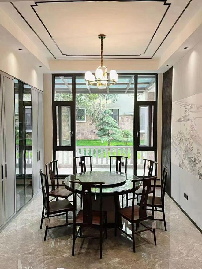 新中式餐厅的设计既保留了传统文化的韵味,又充分考虑了现代生活的需求。餐厅的落地窗设计非常好地解决了采光问题,提供了充足的自然光线杏彩体育,同时也营造了宽敞舒适的用餐环境。带玻璃柜门的实木收纳柜的运用增加了餐厅的收纳面积,也与整体装修风格相协调。