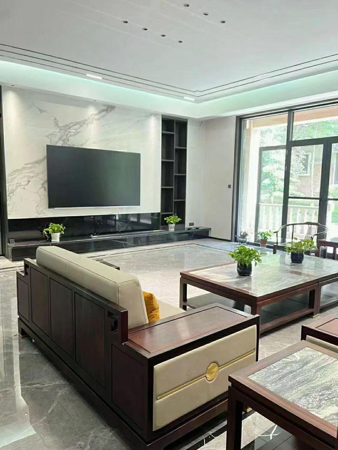 本案中的客厅主要以黑白为主色调,配以棕红、金色等中国传统的吉祥色彩,展现出一种深沉而高贵的美感。在材质上,采用天然的木材、大理石等质感天然的材料,强调自然之美与生命力的表现。在家居陈设上注重文化元素的运用,如中国字画、瓷器、屏风、吊灯等,展现出中国传统文化艺术的独特魅力。