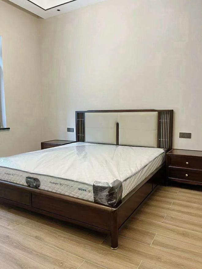 卧室采用深色木质家具,展现出一种温馨、舒适的氛围。卧室设计注重对称美,体现了中式文化的精髓。床头柜是对称放置以突出和谐、平衡的美感。卧室设计注重细节与实用性的结合,营造出舒适、宜居的氛围。