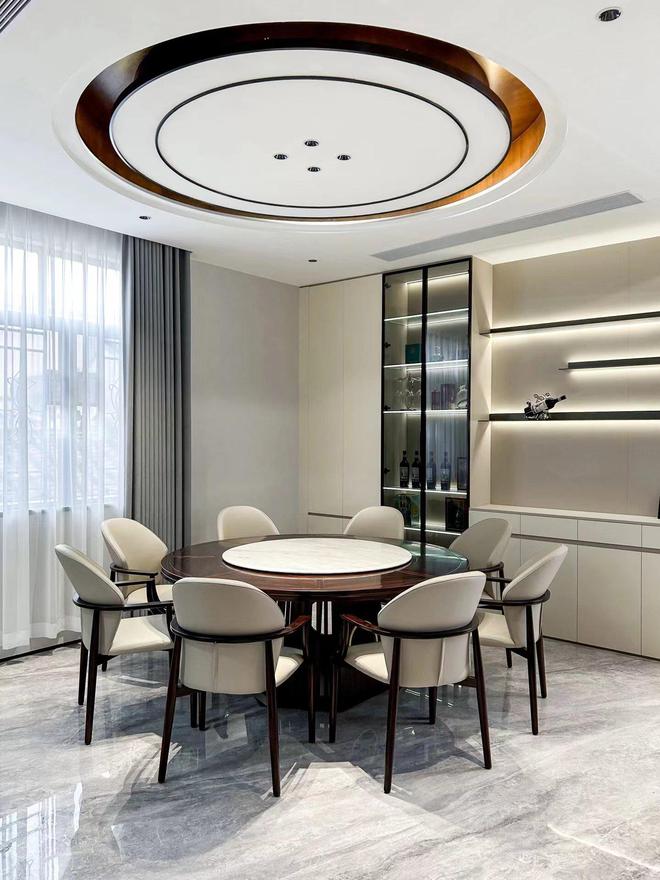 餐厅顶面的设计采用了几何立体圆形的造型,简洁的线条更显精致,搭配无主灯设计,展现出璀璨而不失大气的氛围;米色的墙面与地砖相得益彰,奠定了空间的温馨与舒适,中式实木家具和橱柜的稳重赋予空间东方底蕴,无疑点缀出了中式文化的雅致,为整个空间增添了一抹亮丽的色彩。