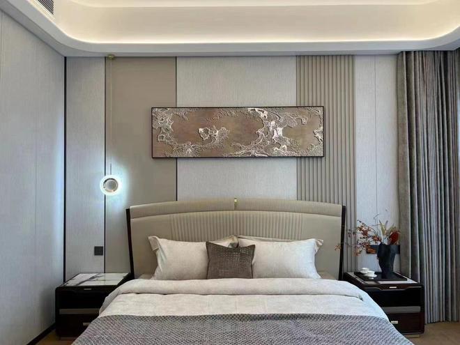 卧室的线条设计规整有序,床边的台灯与现代花式吊灯相映成趣,散发出通明和温和的光芒,浅驼色的墙面漆与米色床铺相互映衬,使空间更具色彩层次感,展现出沉稳的气息,而中式挂画的清韵点缀出艺术气息和雅致氛围杏彩体育,让整个家显得十分温婉宜人。