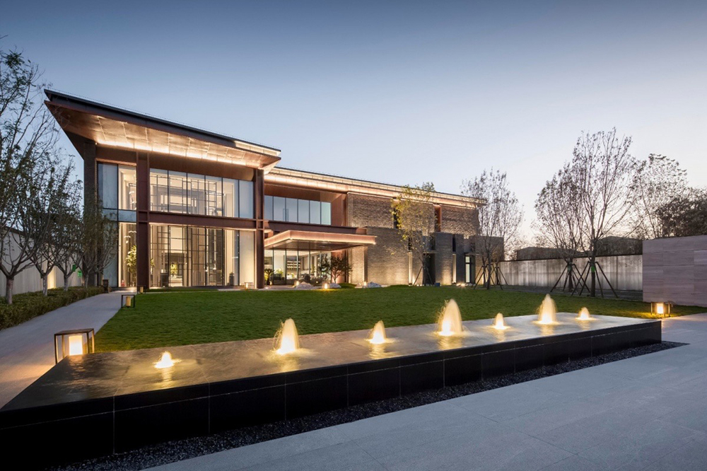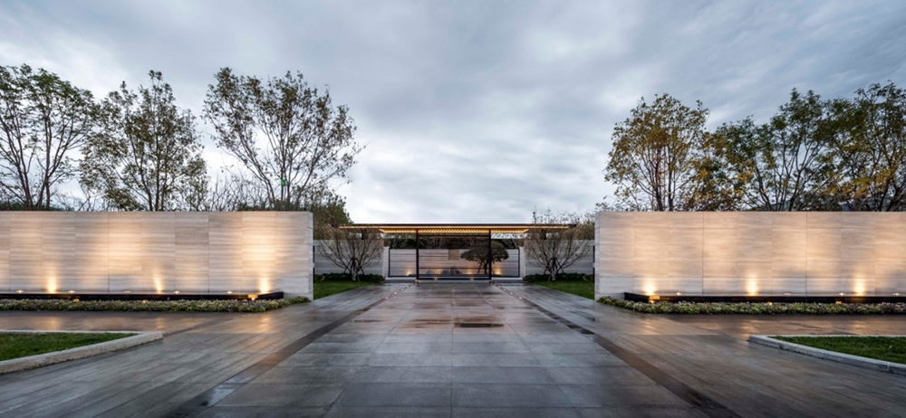 在此次案例中,依山而建的销售中心,曲径通幽、庄重优雅,在建筑中利用空间递进的手法及中式元素的变化,寓意“新中式度假庭院”的概念。