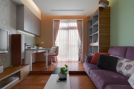编辑推荐:与卧室相连接的起居室,选用同色系的紫色绒布沙发,搭配青绿色背墙,顿时又回到了活泼的公共空间。