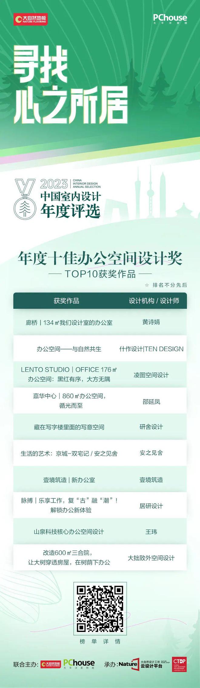 《寻找心之所居 - 2023中国室内设计年度评选》从全国参赛报名的3313套设计作品中,综合设计师/机构参赛作品数量、绿色设计杏彩体育、人文体验、可持续性、细节质感等表现进行实际评比考量,推选出年度十佳办公空间设计奖TOP10,以展示和表彰他们在中国办公空间设计领域所作出的特殊贡献杏彩体育。