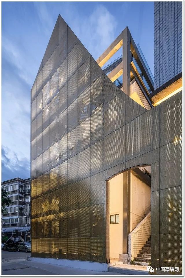 而福建隆重的婚嫁现场给了设计师灵感,项目选用金色的穿孔铝板作为立面,只有金色才能表达泉州曾经的远东第一港口的辉煌历史以及有效地占据新门街的要隘。再把公厕改成bnb,并没有对立面做太大的修改,保留了原来有特色的窗户,仅仅加固结构并粉刷了外墙。