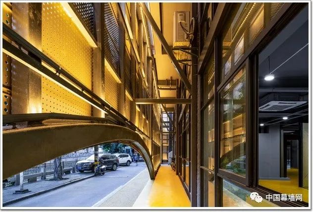 金色大幕将其在街角的显著位置接管过去,它谦虚地隐身其后。蔬菜公司则改建成联合办公,并保留了仿古立面,设计师用有限的资金投入到沿街的控制性立面上,沥青铺满空地,衔接了室内的地坪,呼应立面的金色并明确了设计的边界。到了晚上,金色退位给面纱一般半透明的帷幕,泉州的市花刺桐花则悄悄绽放在这个帷幕之上,煞是好看。