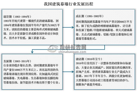 尽管我国建筑幕墙行业起步较晚,但也正是因如此,与传统行业相比,我国建筑幕墙行业受计划经济体制的影响相对较小,因此行业市场化程度相对较高,竞争也较充分,发展速度也较快。到2003年我国建筑幕墙行业便进入发展期,其年平均产量约为在5000万平方米以上,且具有高科技的先进幕墙逐渐出现并得到应用;自2016年之后,受供给侧改革及房地产行业等因素影响,我国建筑幕墙行业便开始进入波动期,且两极分化越发明显。