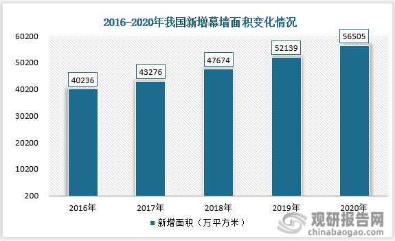 随着我国城市化进程的快速推进,城镇化率的逐年提高,商业楼宇建筑、大型公共建筑、及高端住宅不断涌现增长,使得我国建筑幕墙需求快速增长,幕墙面积逐年增加,市场规模也随之扩大。当前,我国幕墙年产能已经远远超过1亿平方米。根据数据显示,2016年我国新增幕墙面积约为40236万平方米;到2020年其便增长至56505万平方米。