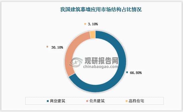 我国建筑幕墙行业从1978年开始起步,经过多年的发展,我国已经成为世界第一幕墙生产大国和使用大国。我国建筑幕墙应用市场结构来看,根据近几年我国幕墙招标统计信息看,,占比约为66.80%;其次便是公共建筑,占比约为30.10%;最后便是高档住宅,占比约为3.1%。