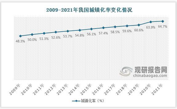 通常,商业建筑、公共建筑面积的增加都离不开城镇化进程的推动。近年来,我国城镇化率的逐年提高。2009年我国城镇化率还不到50%;到2019年国内城镇化率便增长至60.6%;截止到2021年我国城镇化率已经增长至64.7%。