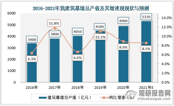 市场规模来看,尽管自2016年行业进入波动期,但是国内幕墙工程总值仍旧是呈现逐年增长态势,只是其增速上下波动较大。根据我国建筑装饰协会统计数据显示,2016年国内建筑幕墙工程总产值约为3400亿元,同比增速约为6.3%;截止到2020年其总产值已经增长至4900亿元左右,同比增速约为8.9%;预计2021年我国建筑幕墙总产值将达到5320亿元左右。