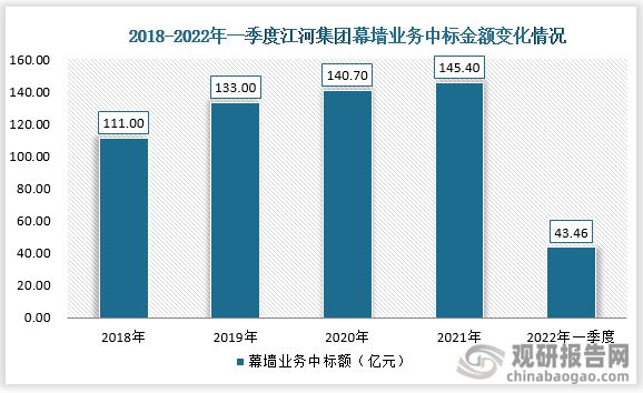 对比我国建筑幕墙行业龙头企业江河近四年来幕墙业务中标金额变化情况来看,其也是呈现逐年递增态势。2018年江河集团幕墙业务中标金额约为111亿元;到2021年年底便增长至145亿元;截止到今年一季度其幕墙中标业务已经达到43.46亿元。