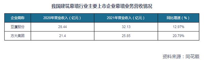 同时,2021年我国建筑幕墙行业主要上市企业亚厦股份、方大集团的幕墙业务营业收入分别为32.13亿元和25.85亿元,同比增速分别为12.97%和20.79%。这也进一步反映出近年来我国建筑幕墙行业市场规模整体向好。
