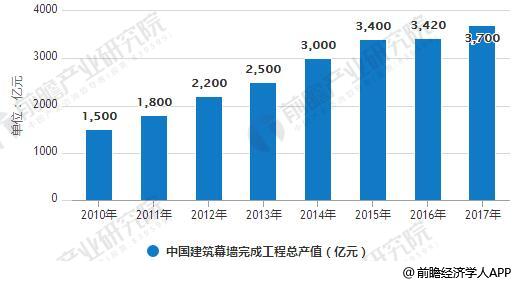 据前瞻产业研究院发布的《建筑幕墙行业市场前瞻与投资战略规划分析报告》统计数据显示,2015年我国建筑幕墙完成工程总产值为3400亿元,2016年我国建筑幕墙完成工程总产值3420亿元,比2015年增加了20亿元,增长幅度为0.6%,与“十二五规划”中的4000亿元,存在500亿元左右的缺口。到了2017年我国建筑幕墙完成工程总产值达到3700亿元左右