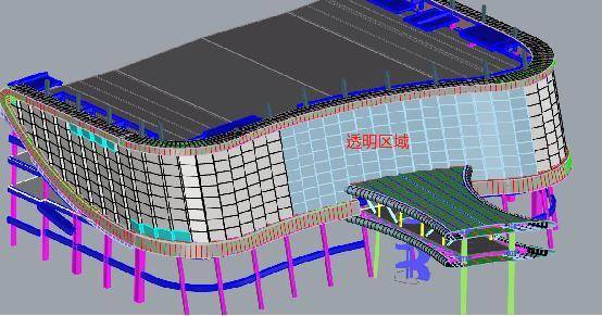 据了解,该建筑东立面的圆弧倾斜的矩齿形拉索玻璃幕墙(以下简称拉索幕墙)、西立面的双曲半单元体式玻璃幕墙以及流线形金属“飘带”和中庭内1100平方米巨幅南昌市地图清水混凝土板幕墙是整个建筑的难点与亮点所在,所用幕墙超过5500多种不同尺寸的异形玻璃、19142块不同尺寸的异形金属面板、近32480种不同型材的加工,超10万种龙骨定位数据需提取……这是一个庞大却又精密的工程。