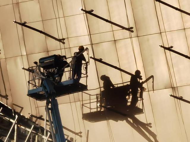 建设最高峰时期有230名工人同时施工, 28台高空车,1台蜘蛛车,26台剪刀车,64台吊篮轮番运作