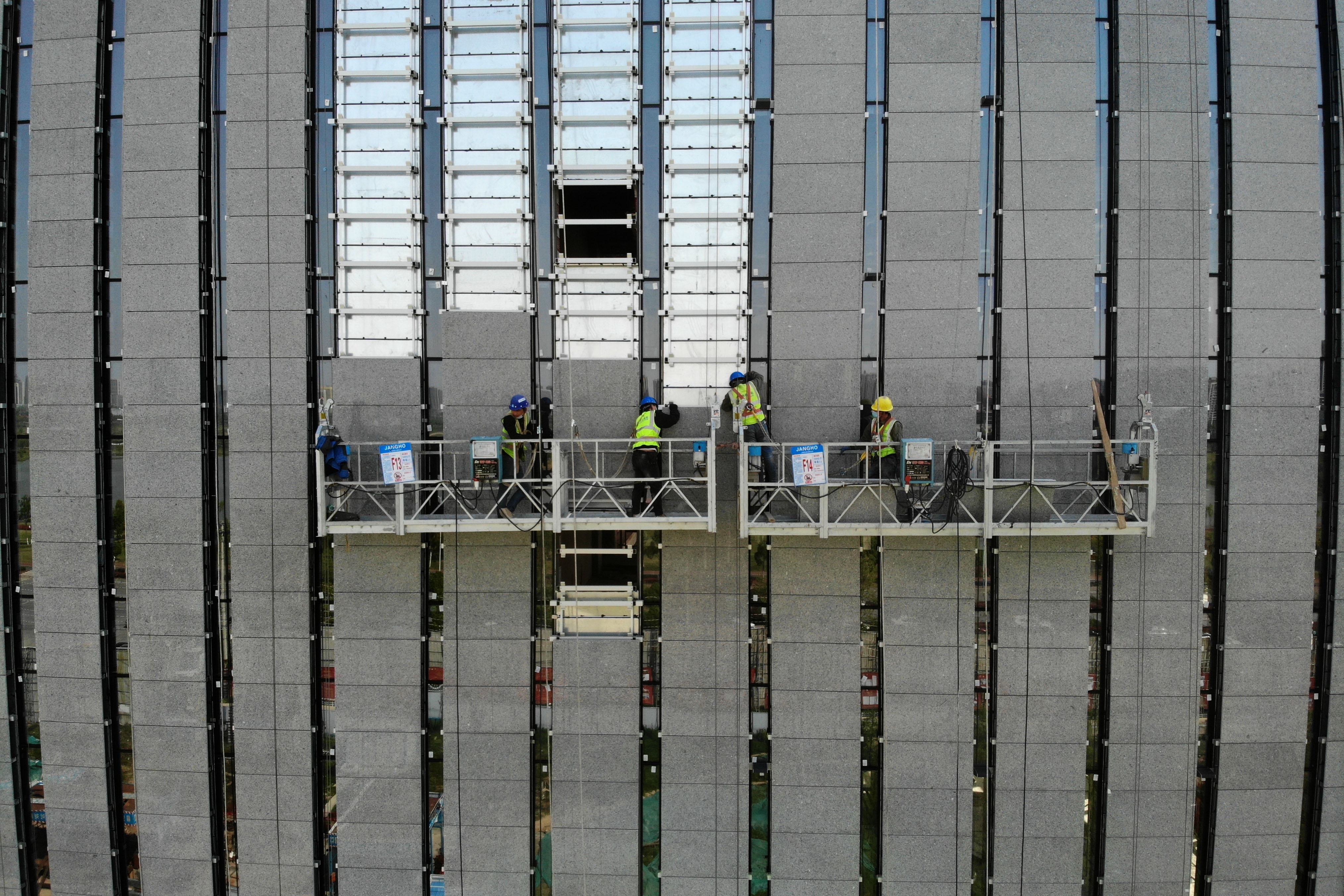 4月13日,工作人员在中科院量子信息与量子科技创新研究院施工项目现场安装玻璃幕墙(无人机照片)。