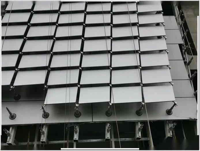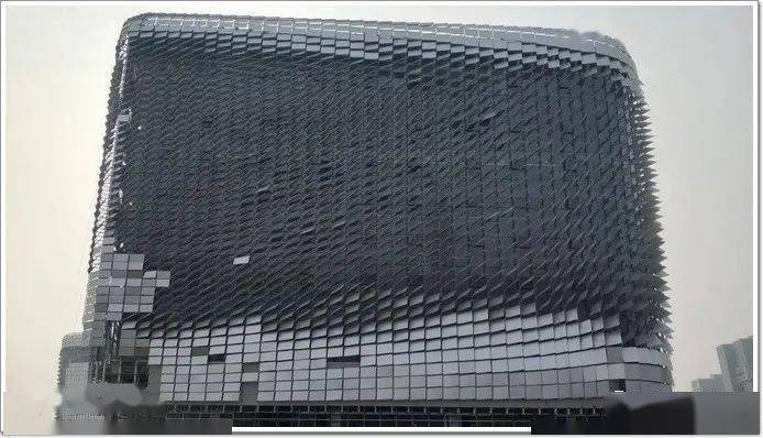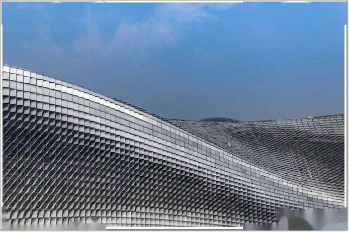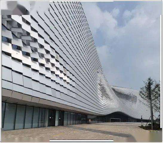 其中项目所采用的阳极氧化铝单板的表面,通过电流使导电的酸性电解液电解,使构成阳极的铝金属外表发生氧化,在铝外表天然生成一层厚而细密的 氧化铝保护膜,一定程度上避免了沾染灰尘,使得每一块阳极氧化铝单板具有了自洁功能。整个建筑外形为曲面造型,为实现幕墙整体的角度和疏密变化,保证铝板之间间隙一致,完美呈现动态、渐变的视觉效果。