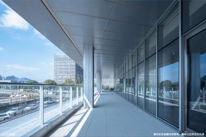 建筑使用极简的理念尽力做到开阔少遮挡,极致的悬挑、视觉空间的通透与连续使得整个售楼处宛若悬浮空中。