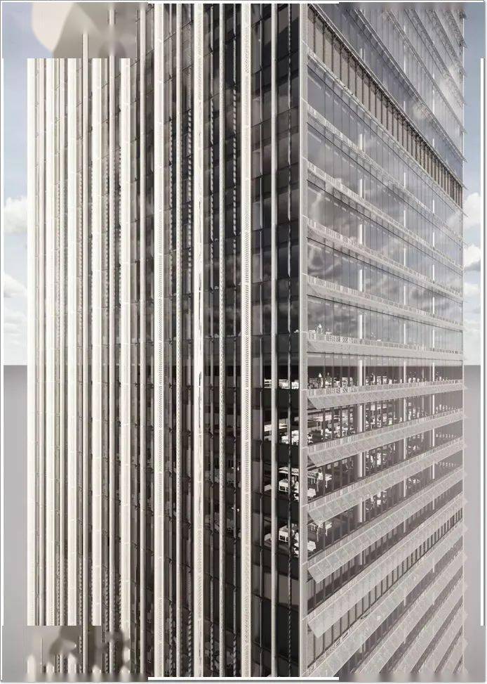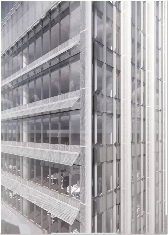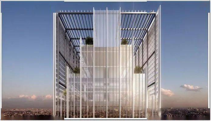 FGP Atelier在建筑设计中,将矩形基座与顶点之间形成了动态张力,并且在顶点之间形成了一系列可欣赏城市景观的露台。所有这些露台都有遮挡风雨的玻璃,这种设计风格的加入,为了给建筑一种宏大的凝聚力。
