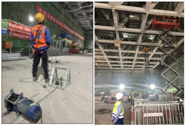项目深化设计团队把目光投向了装配式施工,经过严格论证,项目部总结出一条标准化、模数化、集成化的施工思维,通过定变量的方式对宴会厅进行统一深化设计并核算材料损耗,在现场后场对材料进行集中模数化开料并进行集成化组装,最终通过卷扬机垂钓和剪刀车施工的措施最终实现了宴会厅转换层装配式施工,不但解决了超高宴会厅施工的难题、更有效推进了施工进度。