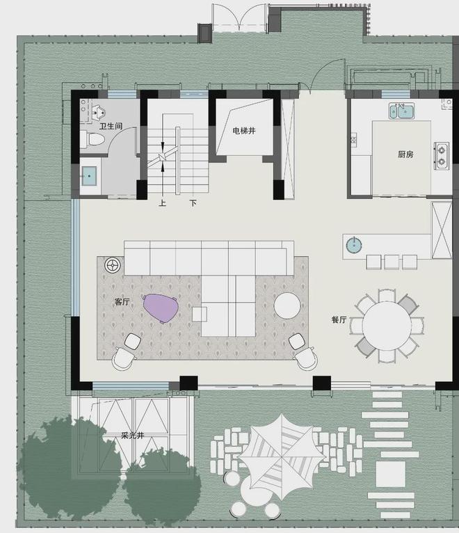 一楼总面宽约13.6米,这个尺度下,排布了约8.4米的大横厅,约5.2米的朝南套房,U字型的厨房,三段式的楼梯,双直排的玄关…每一寸空间都极尽舒适。