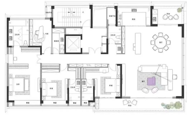 南向约23.2米极幕面宽,除了有面积近80㎡的超大方厅,还有三个全套房设计的卧室,全屋尽享“酒店式体验”。